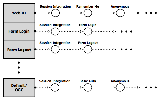 Security filters are maintained in the filter chain which maintains the mapping of the filters to be applied to a specific type of request. For example the filters applied to a web UI request are different than those applied to an OGC or REST request.