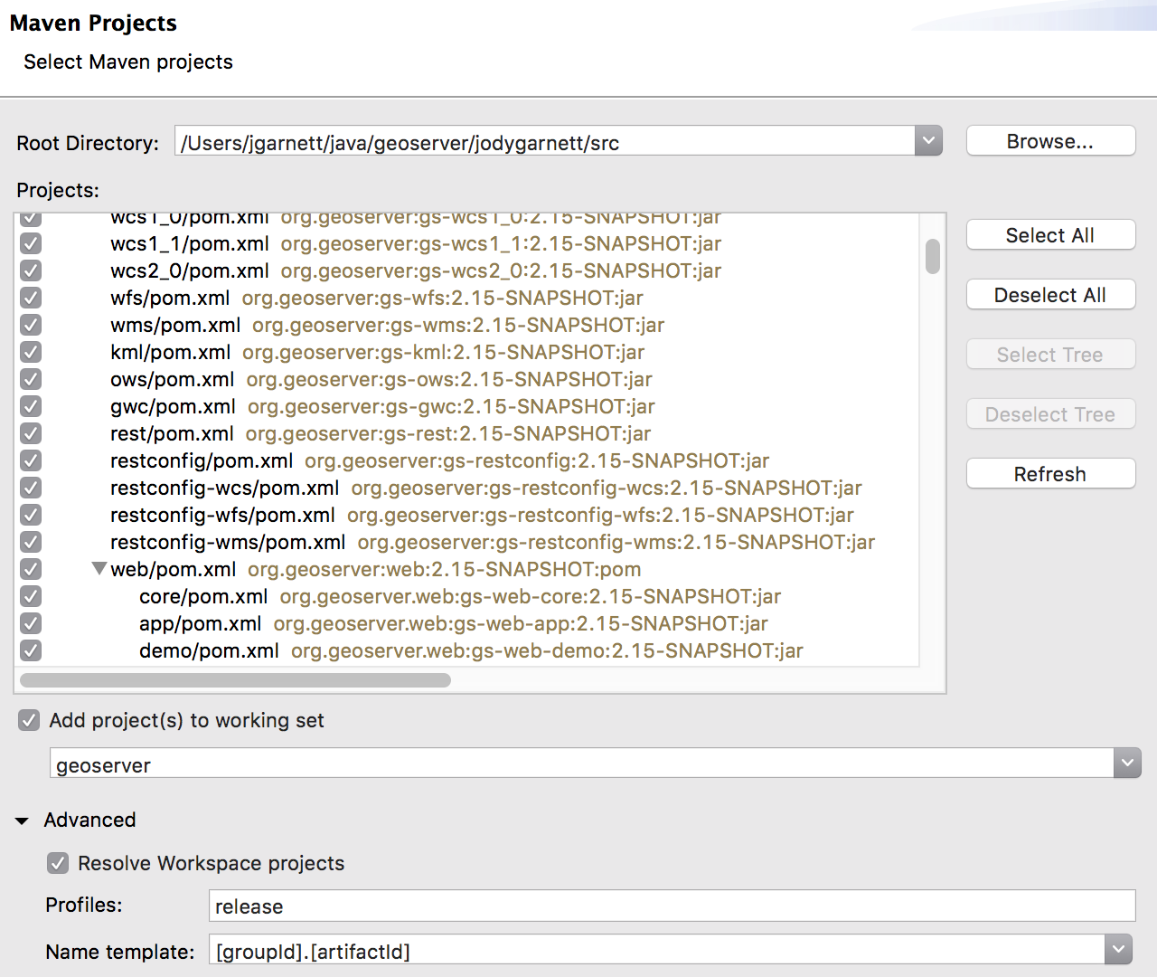 mvn compile [INFO] --- javacc-maven-plugin:2.3:jjtree (jjtree) @ gs-wcs1_1 --- Java Compiler Compiler Version 4.0 (Tree Builder) (type "jjtree" with no arguments for help) "src/wcs1_1/target/jjtree/org/geoserver/wcs/kvp/rangesubset/ASTFieldId.java" does not exist. Will create one. ... Annotated grammar generated successfully in src/wcs1_1/target/jjtree/org/geoserver/wcs/kvp/rangesubset/rangeset.jj [INFO] [INFO] --- javacc-maven-plugin:2.3:javacc (javacc) @ gs-wcs1_1 --- Java Compiler Compiler Version 4.0 (Parser Generator) (type "javacc" with no arguments for help) Reading from file src/wcs1_1/target/jjtree/org/geoserver/wcs/kvp/rangesubset/rangeset.jj . . . File "TokenMgrError.java" does not exist. Will create one. File "ParseException.java" does not exist. Will create one. ... Parser generated successfully. [INFO] [INFO] --- fmt-maven-plugin:2.4.0:format (default) @ gs-wcs1_1 --- [debug] Using AOSP style [INFO] Processed 47 files (0 reformatted). [INFO]