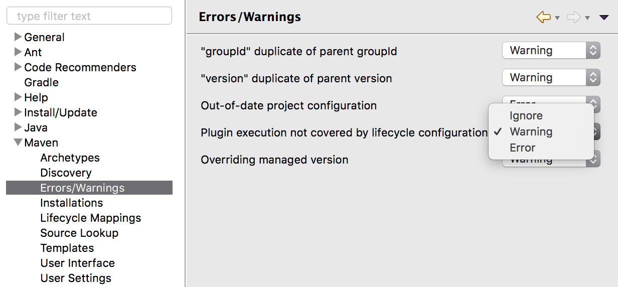- Go to Preferences and navigate to Maven --> Errors/Warning