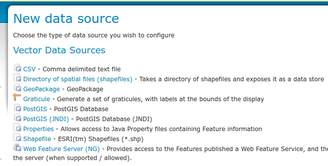 Once the extension is installed, the new graticule store should show up in the New data source page: