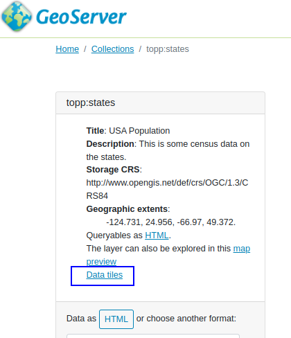Collections with vector tiles enabled will have a "data tiles" link pointing at the tiles endpoint