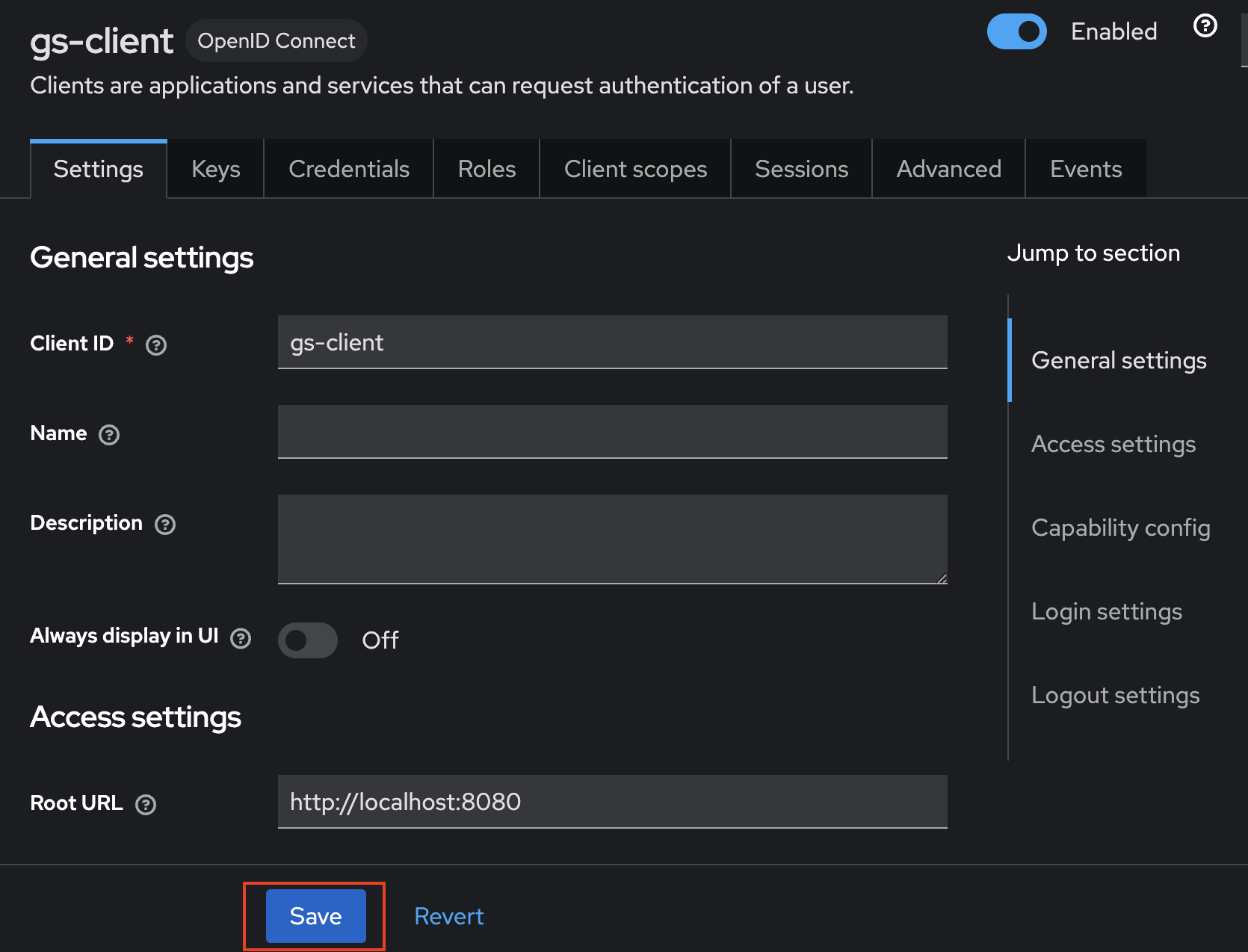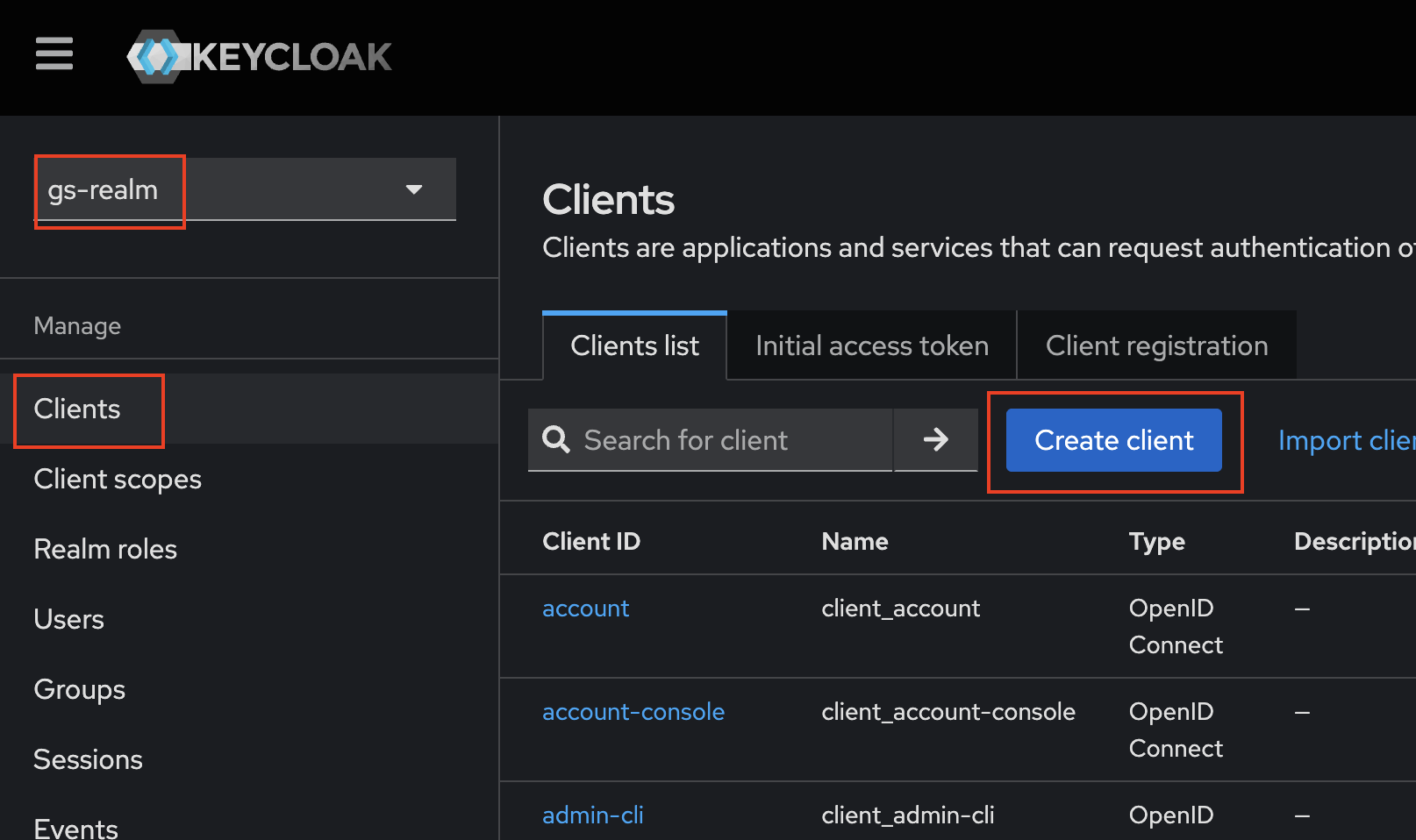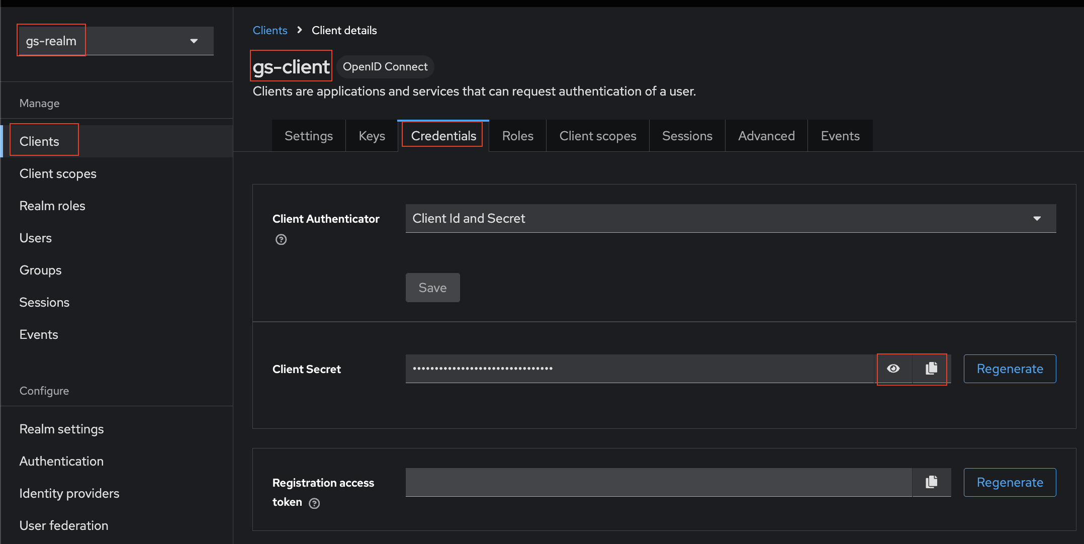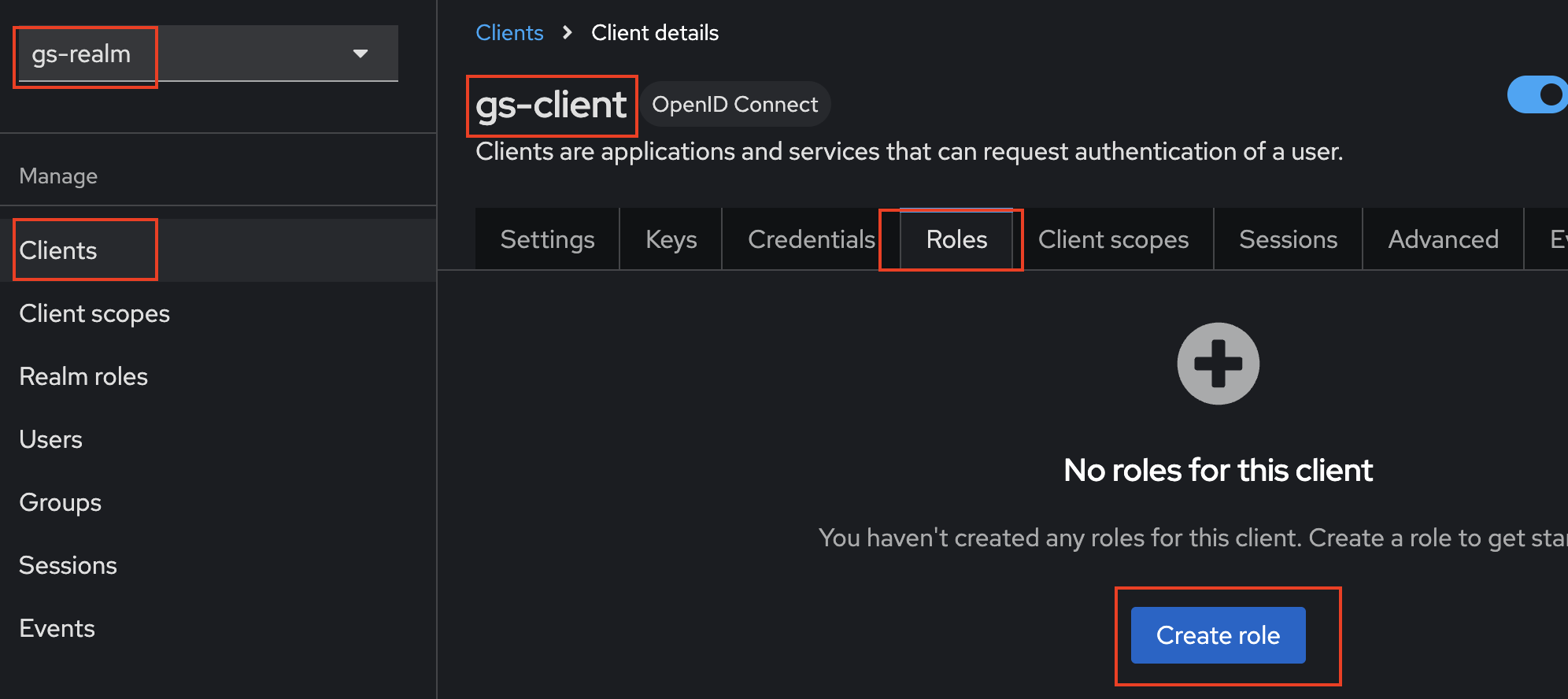 Navigate to your Client ("gs-client") in your Realm ("gs-realm")