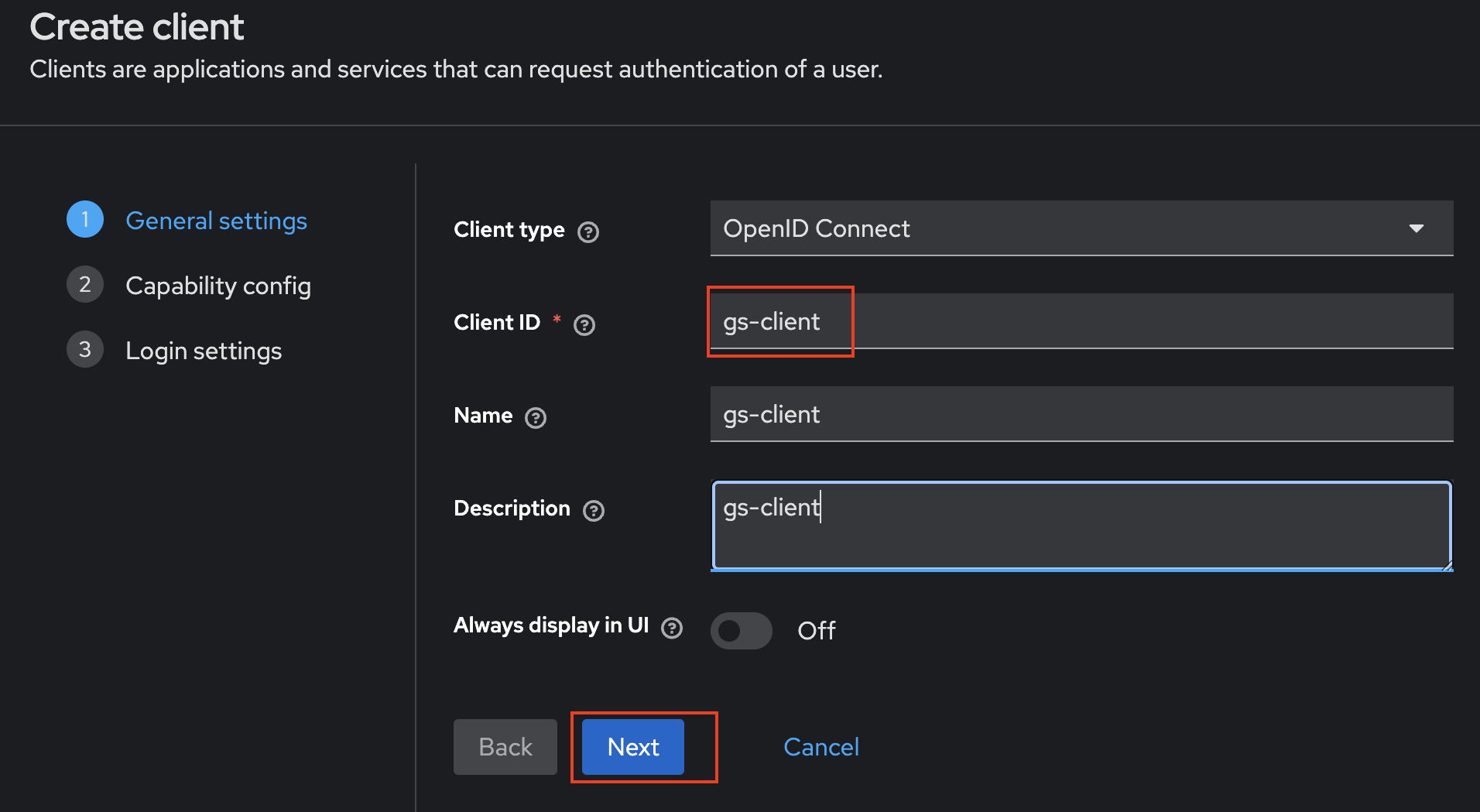 - "Client Id" is "gs-client" (name of the Keycloak client you created)