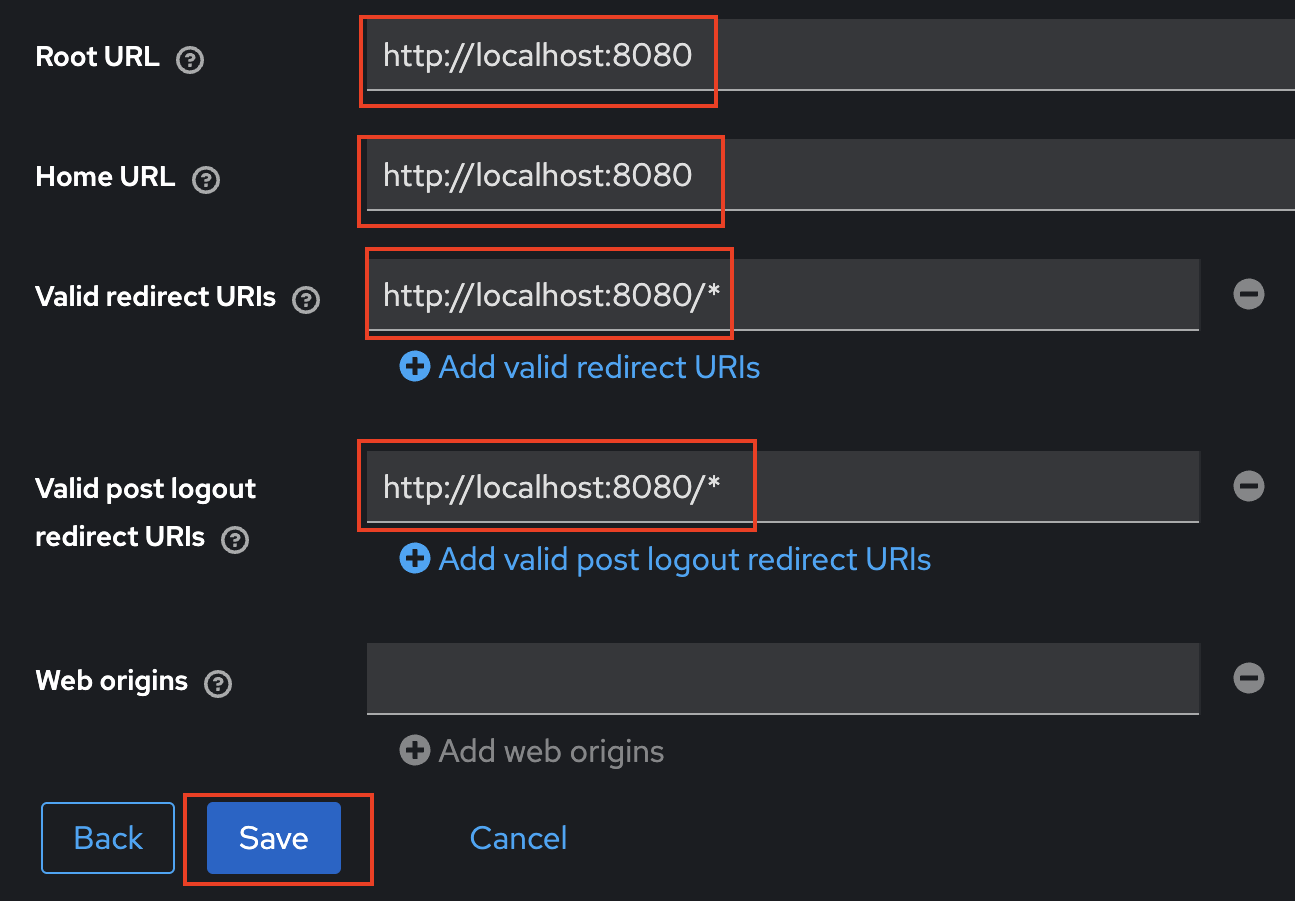 Set the "Root URL" and "Home URL" as "http://localhost:8080". Set the "Valid post logout redirect URIs" and "Valid redirect URIs" as "[http://localhost:8080/](http://localhost:8080/)*". Then press "Save".