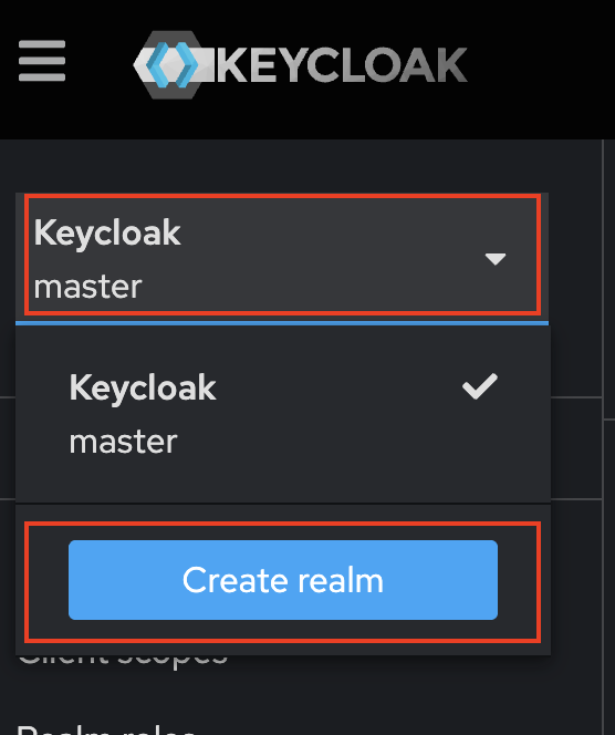 In the top left corner, click on "Keycloak master" and then "Create realm"