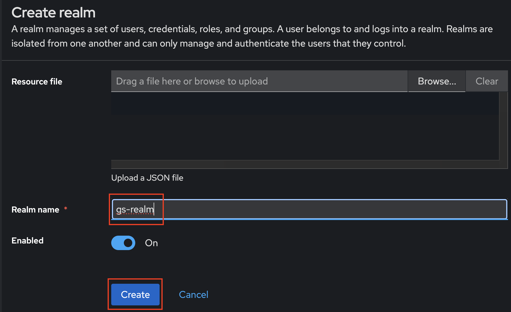 Give the realm a name (i.e. "gs-realm") and then press "Create"
