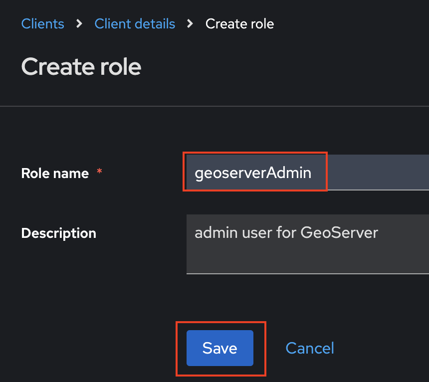. Set the role's name as "geoserverAdmin" and press "Save"¶