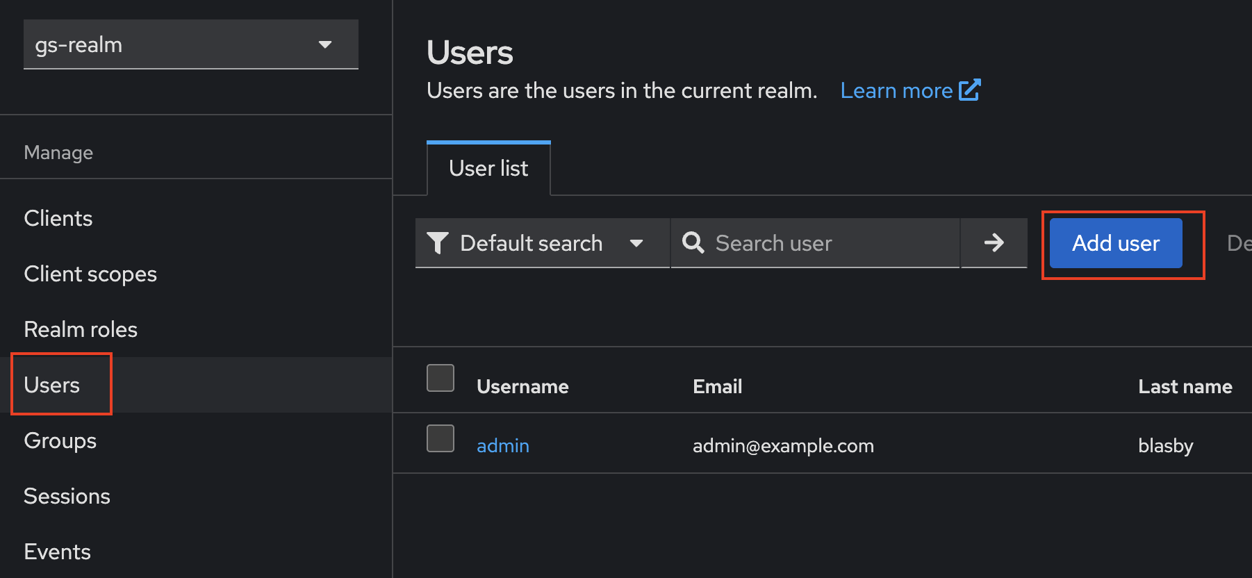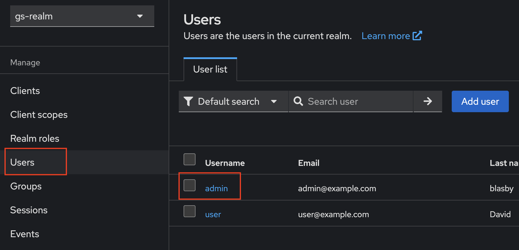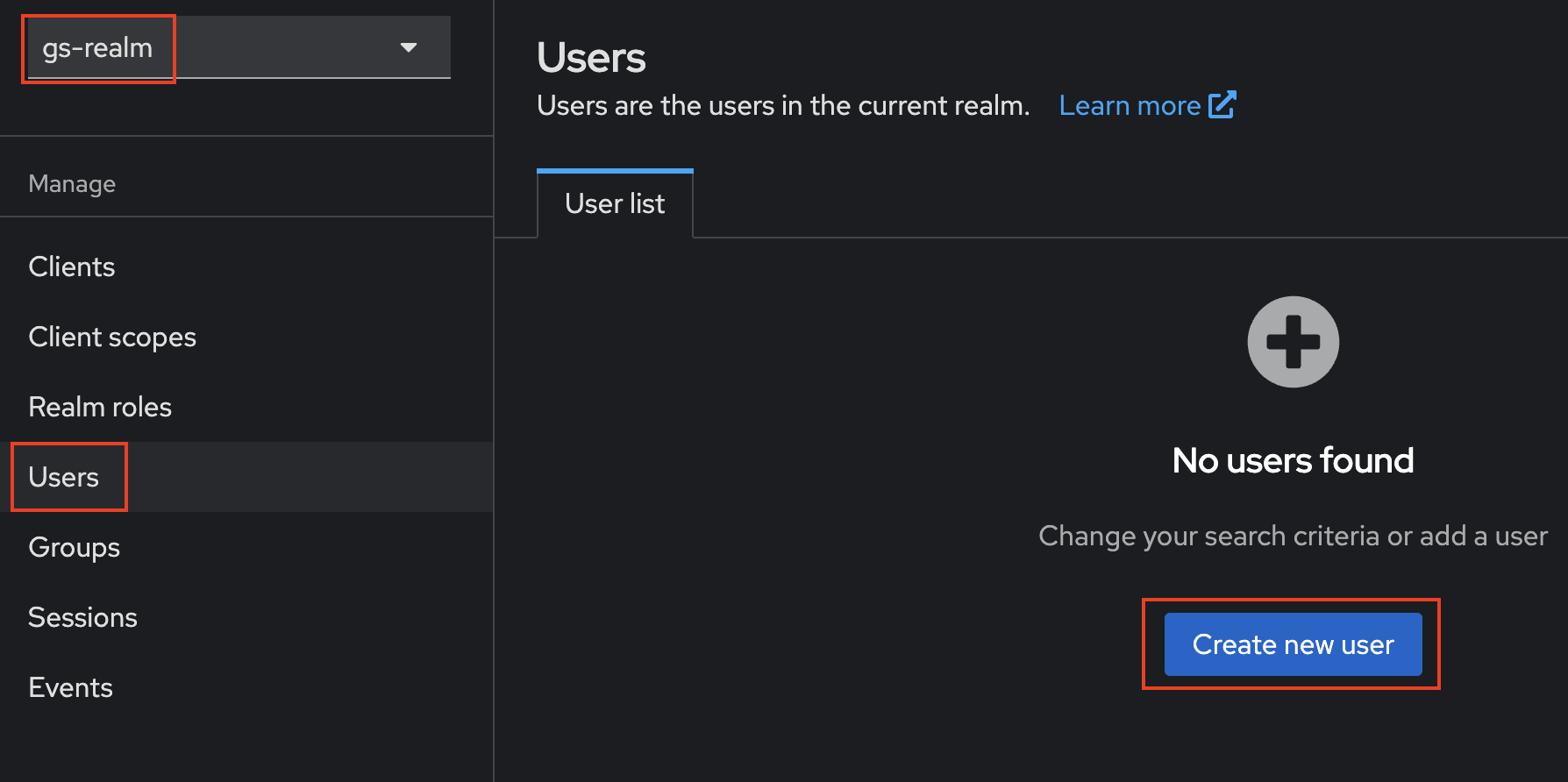- Make sure you are in the correct realm ("gs-realm") in the top left corner