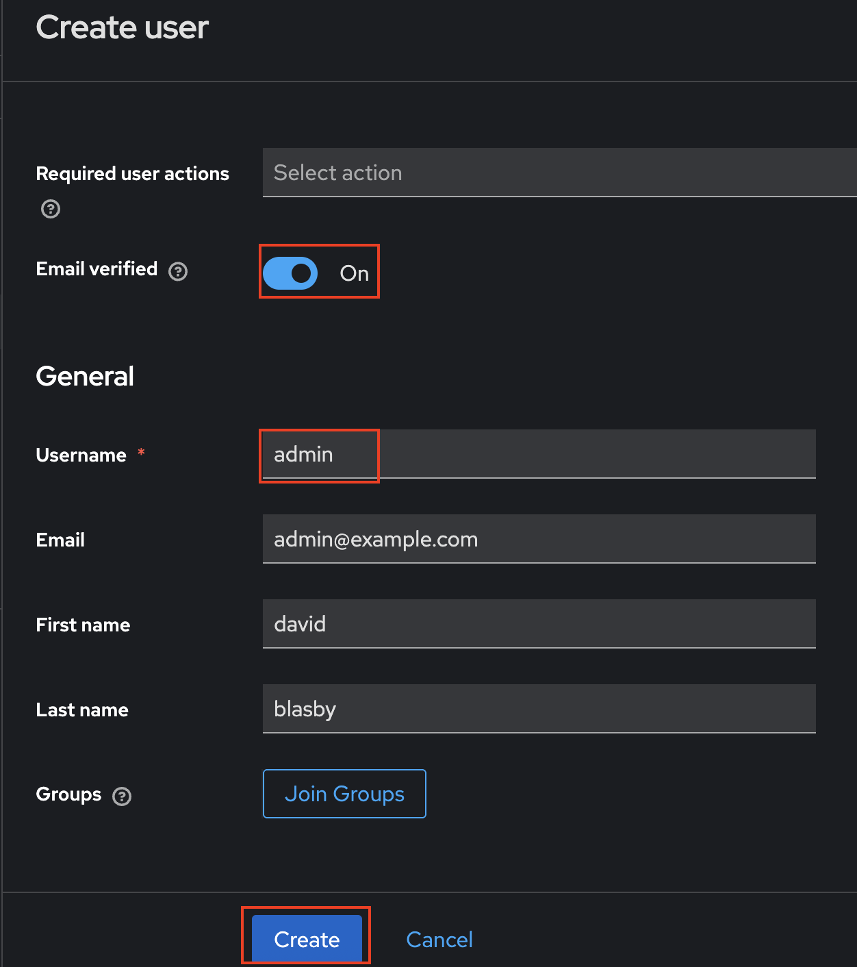 Create the "admin" user - you can use your own name and email if you want. Ensure that the user's email is verified. When finished, press "Create".