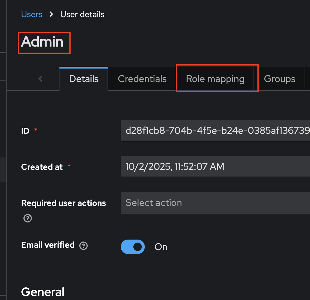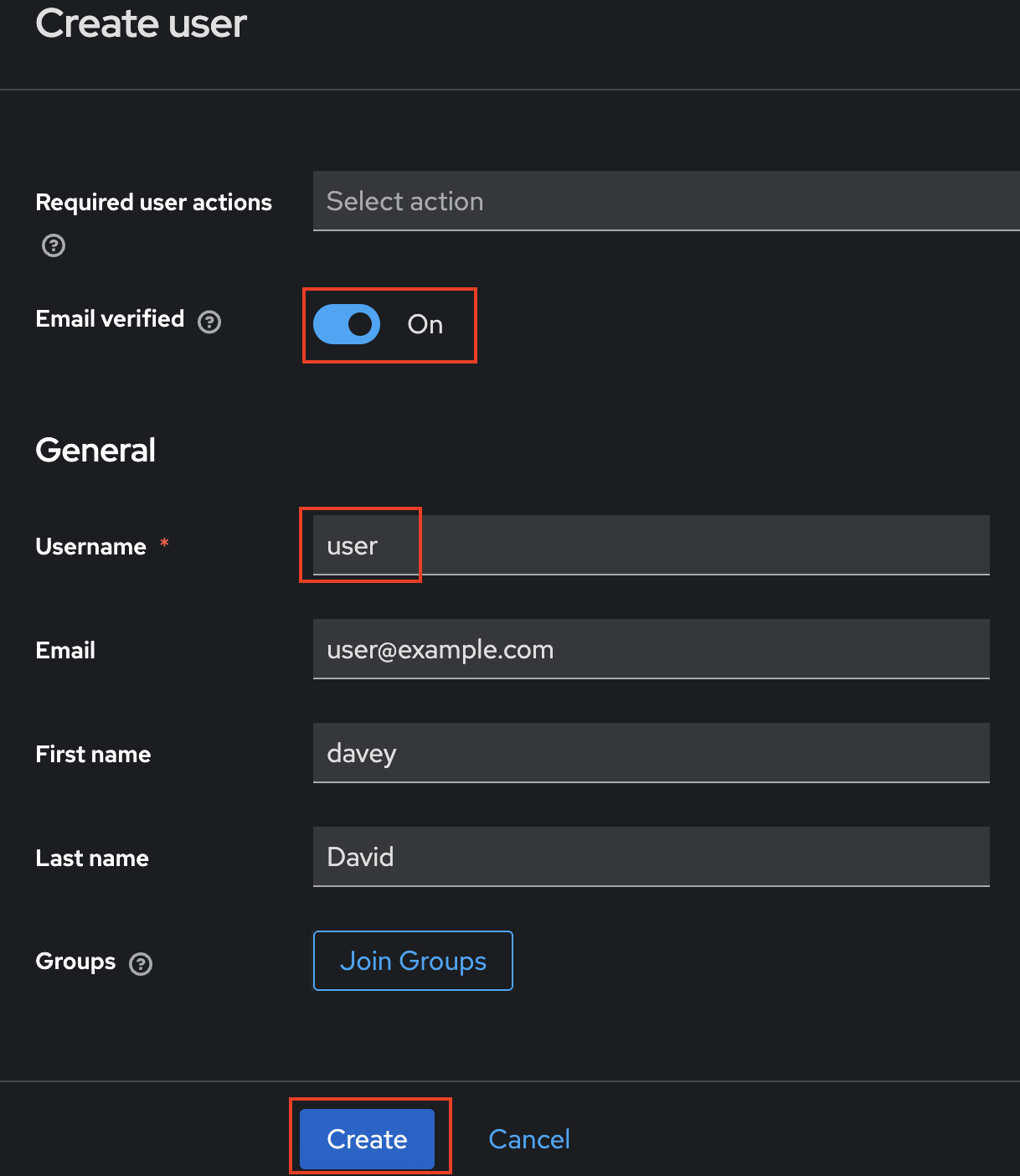 Add the "user" user. Ensure that the user's email is verified. When finished, press "Create". On he next screen, press "Save".
