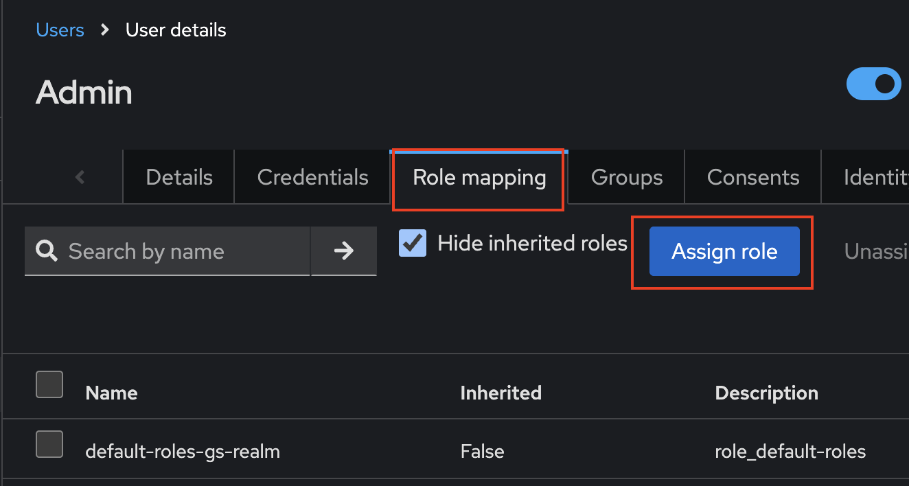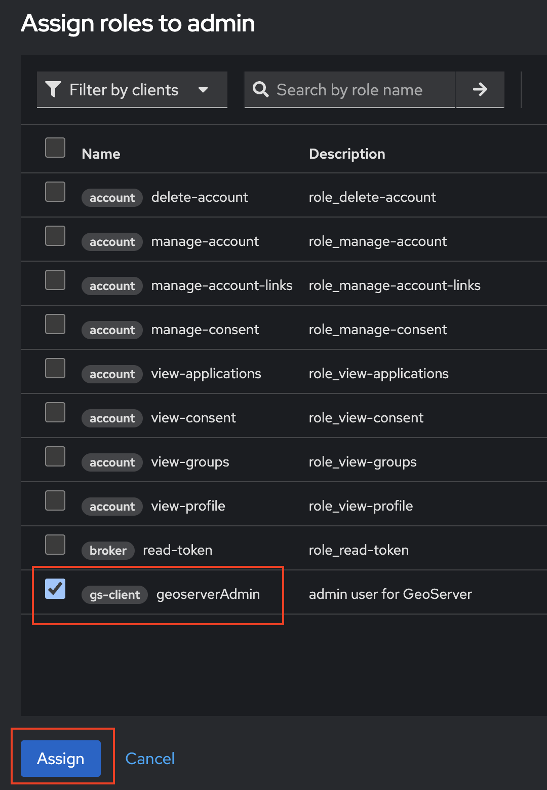 - Check the "geoserverAdmin" role, and then press "Assign"