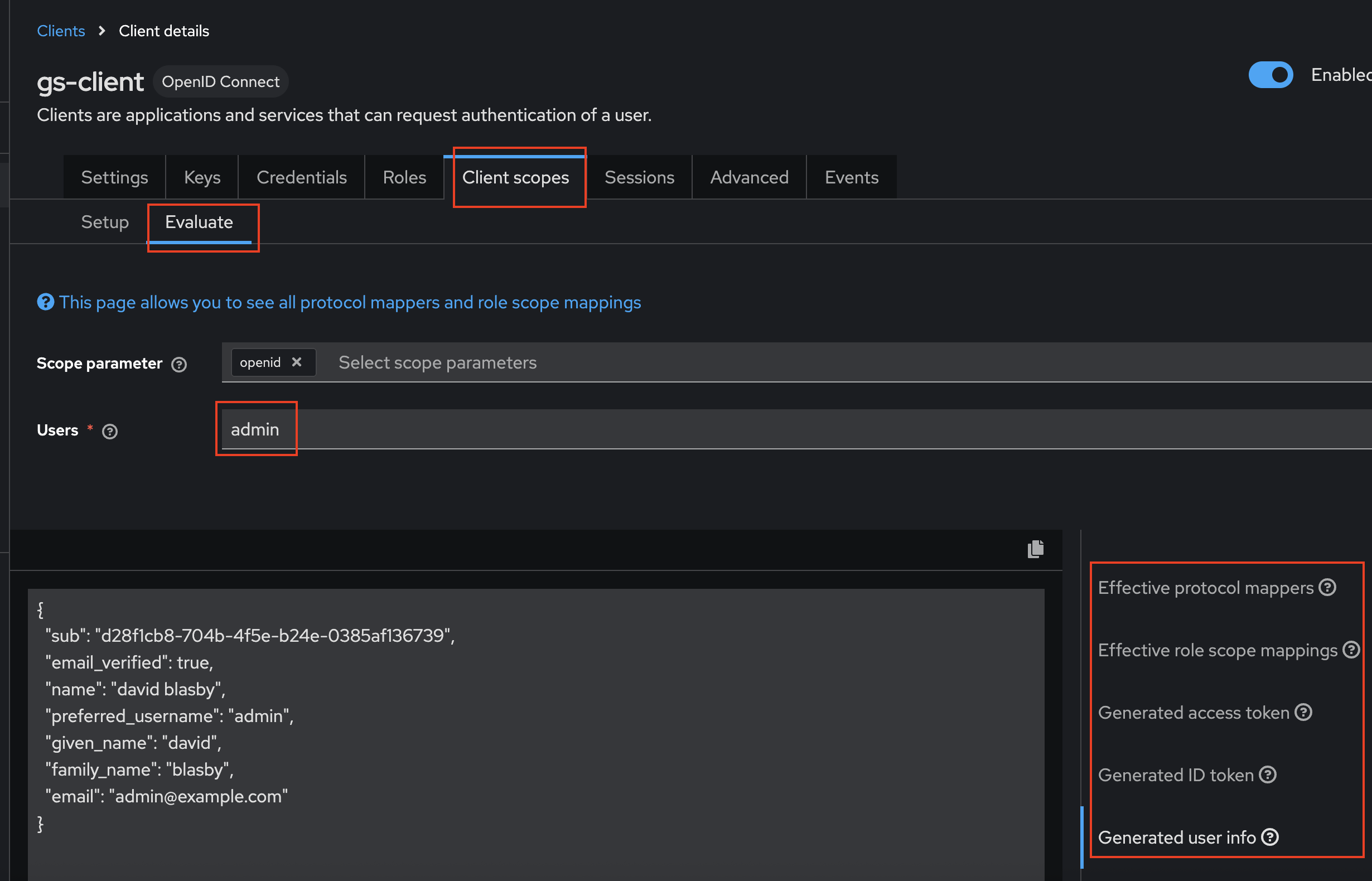 json { "sub": "d28f1cb8-704b-4f5e-b24e-0385af136739", "resource_access": { "gs-client": { "roles": [ "geoserverAdmin" ] }, "account": { "roles": [ "manage-account", "manage-account-links", "view-profile" ] } }, "email_verified": true, "name": "david blasby", "preferred_username": "admin", "given_name": "david", "family_name": "blasby", "email": "admin@example.com" }