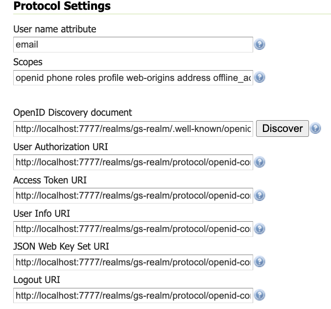 - In the "OpenID Discovery Document" type in "http://localhost:7777/realms/gs-realm/.well-known/openid-configuration"