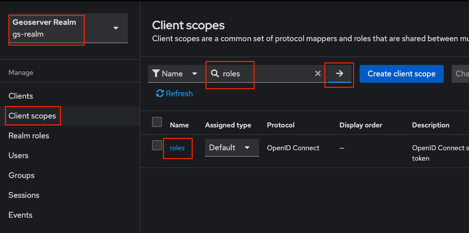 One the left column, choose "Client scope". In the search box, enter "roles" and press the "->" search button. In the results, click on "roles".