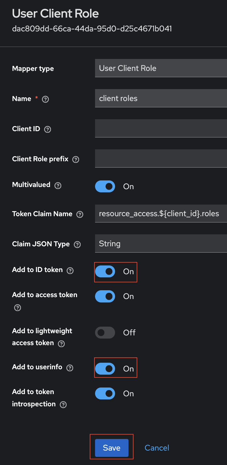 . Turn on "Add to ID token" and "Add to userinfo". Then press "Save".¶