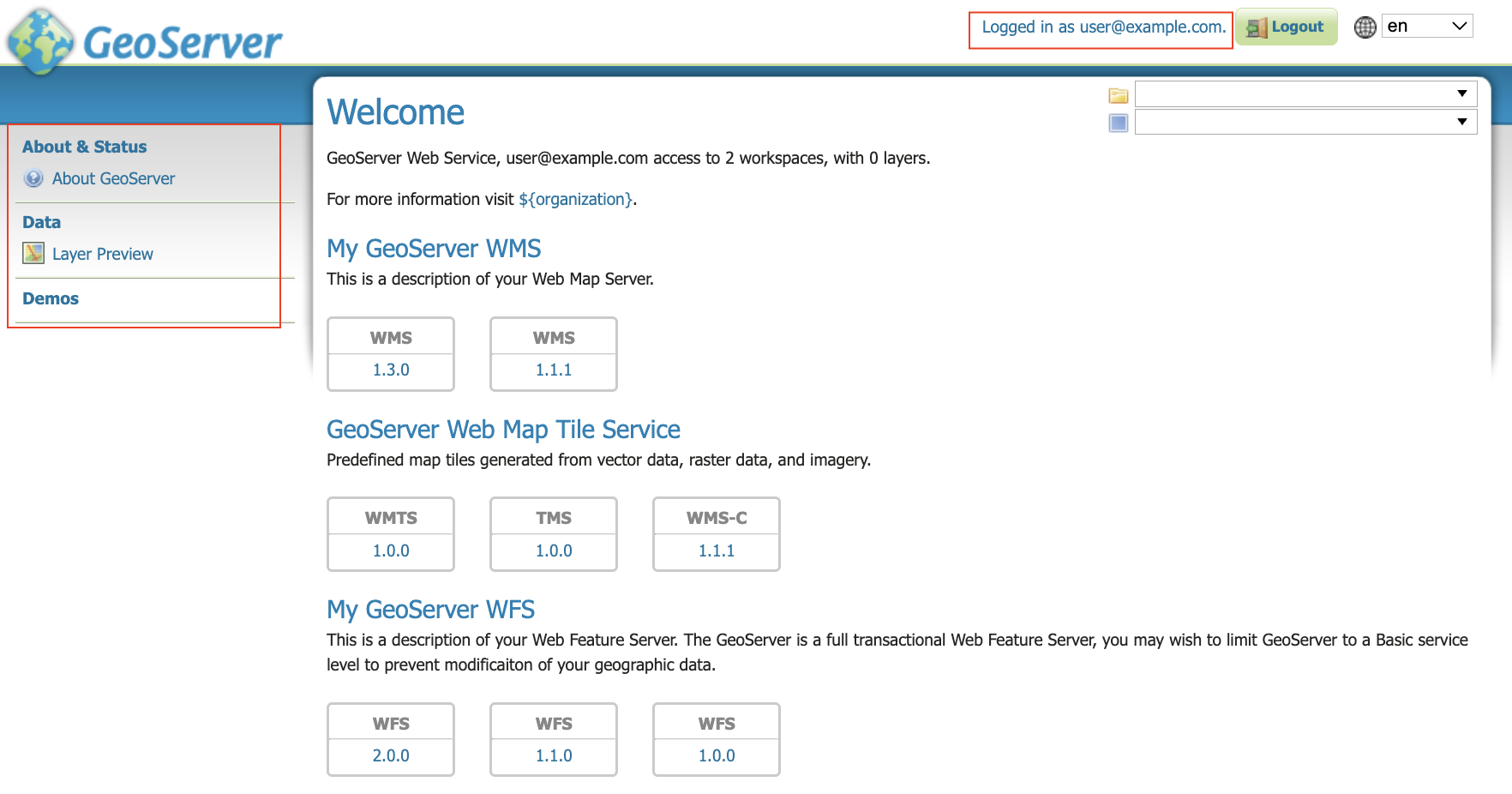 If you login as "admin", you should see the GeoServer administration screens. If you login as "user", you will not.