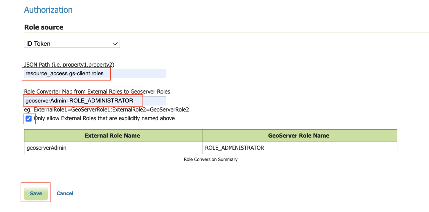- Set "geoserverAdmin=ROLE_ADMINISTRATOR" as the "Role Converter Map"