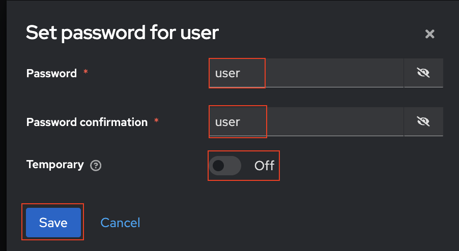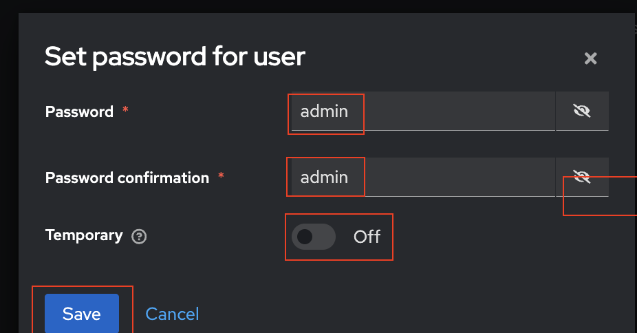 Fill in the Password as "admin" and set "Temporary" to "off". Press "Save" and Confirm setting the password.