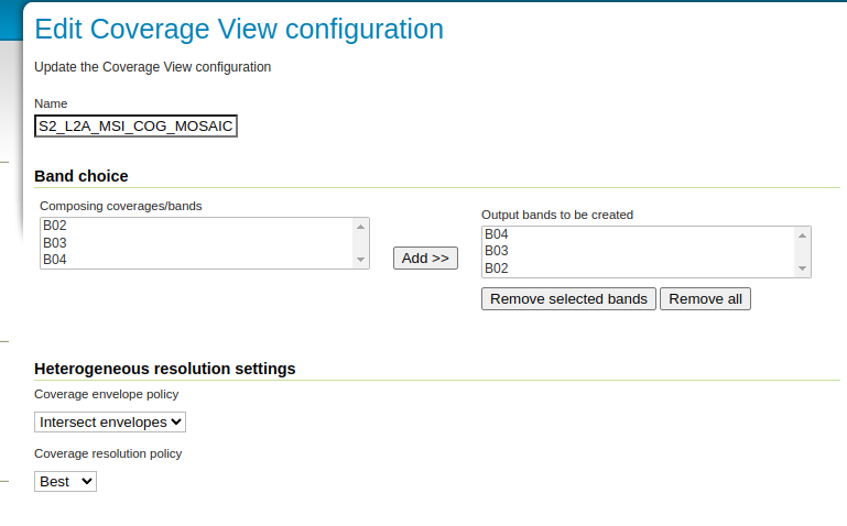 Once the mosaic is configured in GeoServer, create a new coverage view setting up the bands according to the desired order: