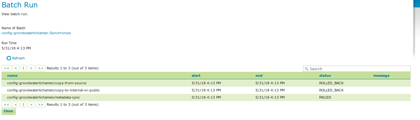 In case that the conditions are met, batch runs can be started, and the status/history of current and past batch runs can be displayed. Current batch runs can be interrupted (which is not guaranteed to happen immediately).