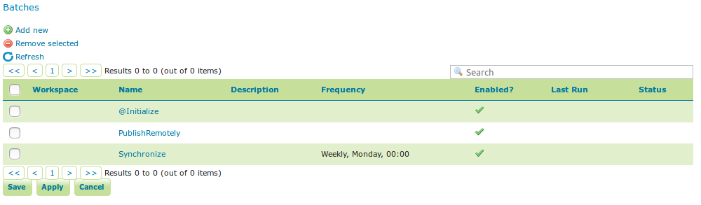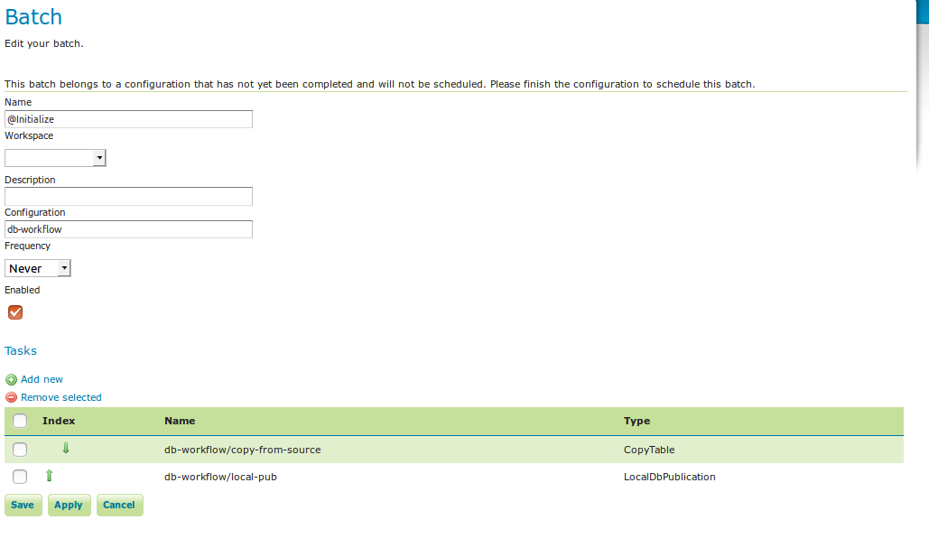 Batches can be created and edited from here as well, however the configuration must exist in order to be able to do that (in case of a new configuration, you must click apply once before you can create new batches). New tasks must also be saved (again, via the apply button) before they can be added to a batch. In case that the conditions are met, batch runs can be started, and the status/history of current and past batch runs can be displayed. Current batch runs can be interrupted (which is not guaranteed to happen immediately).