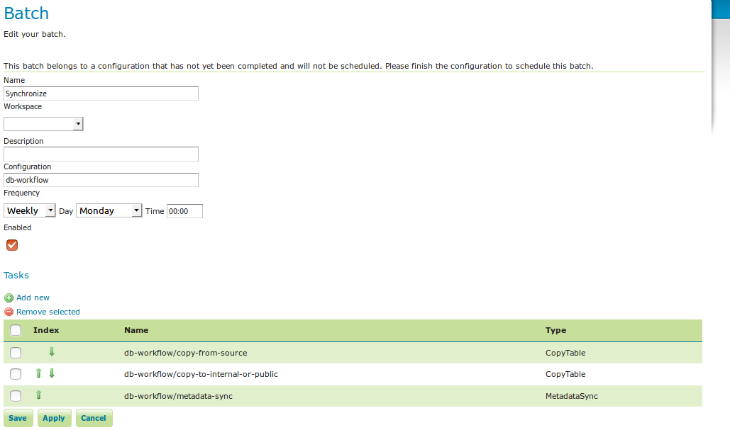 Once you open a new or existing batch, one can add or remove tasks from it and change the order of the tasks. You can also enable/disable the batch (if disabled, the batch is not scheduled) and choose the scheduling time. The user can choose between a daily schedule (with time), weekly (with day of week and time), monthly (with day of month and time) or specify a custom cron expression.