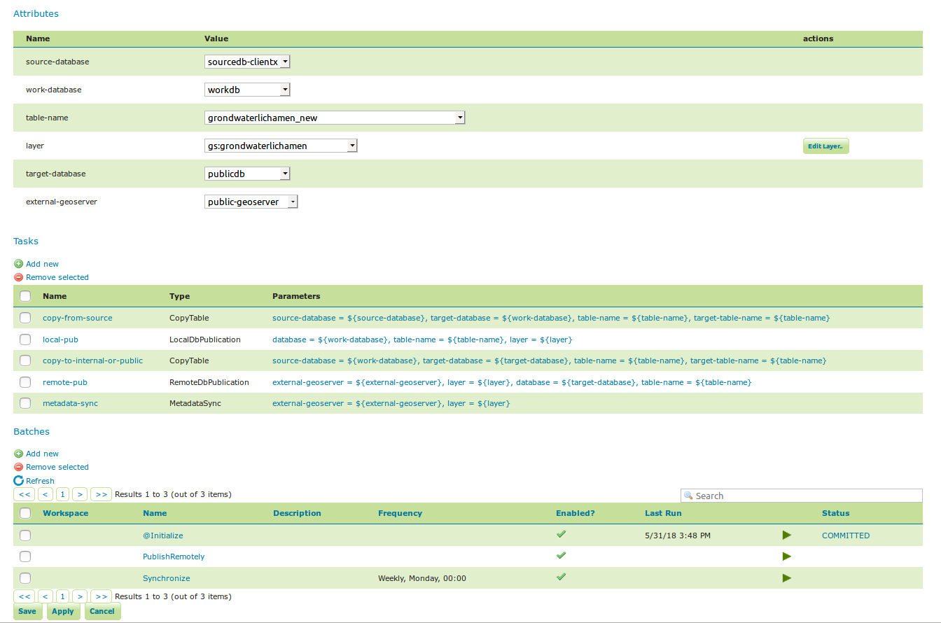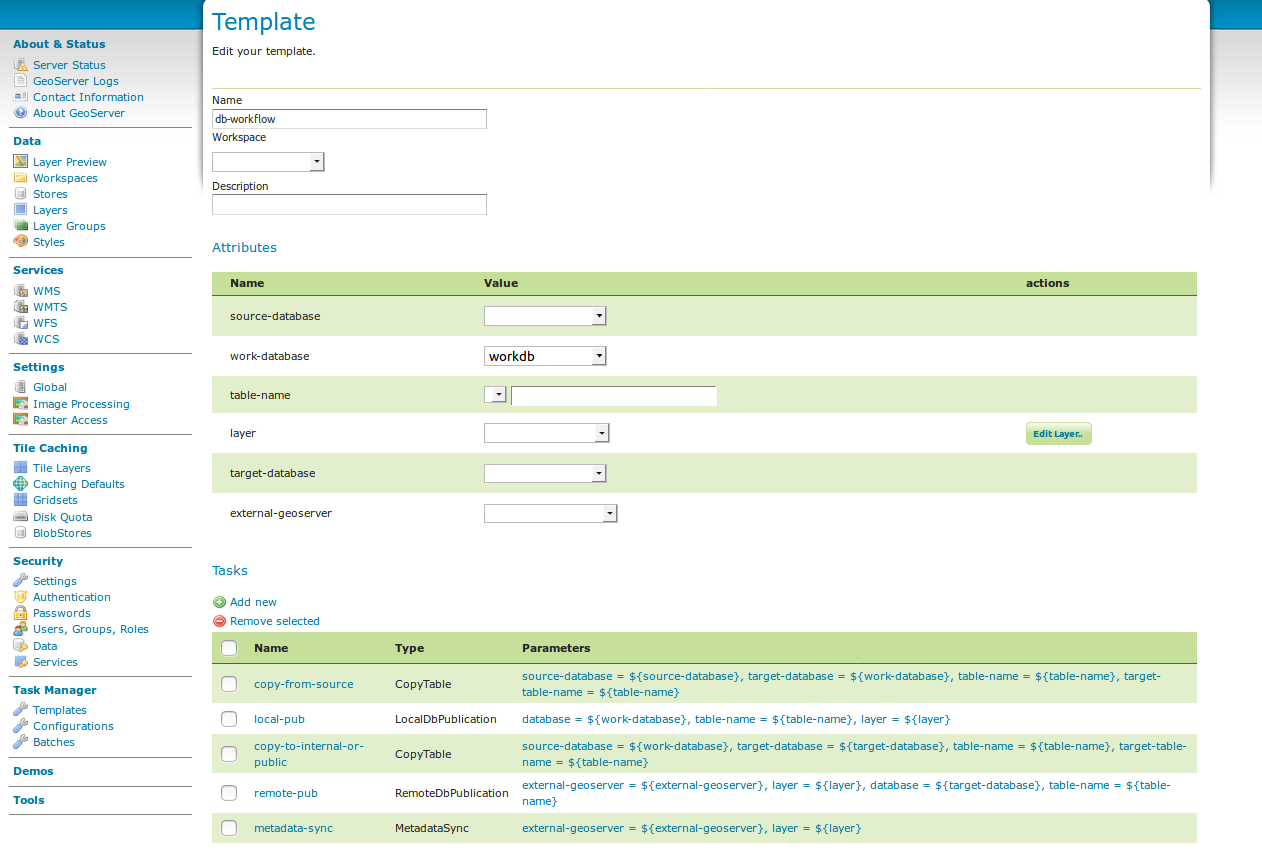 CopyTableTaskCopy a database table from one database to another. The user can specify a source database, source table name, target database and target table name. The source table name may also be a view. If the source does not contain a primary key column (f.e. if it is a view), an additional column 'generated_id', with an automatically generated primary key will be added to the destination table. The task will also copy all existing indexes. If the source table contains a geometry column but not a spatial index (f.e. if it is a view), a spatial index will automatically be added to the destination table. Supports commit/rollback by creating a temporary table.CreateViewTaskCreate a view based on a single table. The user can specify the database, the table name, the selected fields and (optionally) a where condition. Supports commit/rollback by creating a temporary view.CreateComplexViewTaskCreate a view based on a multiple tables. The user can specify the database and a whole query, where it can use any other configuration attribute in the form of '\${placeholder}'. Supports commit/rollback by creating a temporary view.CopyFileTaskCopy a file from one file service to another. Commit/rollback is supported by a versioning system, where the version of the file is inserted into the file name. The location of the version number is specified in the path as###(or set auto-versioned totrueto add the placeholder automatically before the extension dot). On commit, the older version is removed. On rollback, the newer version is removed. The publication tasks will automatically publish the latest version.LocalDbPublicationTaskPublish a database layer locally. The user can specify database, table and a layer name. Supports commit/rollback by advertising or removing the layer it created.RemoteDbPublicationTaskPublish a database layer to another geoserver. The user can specify a target geoserver, a source layer and a target database. All information is taken from the source layer except for the target database which may be different. Supports commit/rollback through creating a temporary (unadvertised) layer. This task also supports the version place holder or auto-versioning, in order to combine with theCopyFileTask.LocalFilePublicationTaskPublish a file layer locally (raster or shapefile). The user can specify a file service, a file (which can be uploaded unto the service) and a layer name. Supports commit/rollback by advertising or removing the layer it created.RemoteFilePublicationTaskPublish a file layer locally (taster or shapefile). The user can specify a target geoserver, a source layer and a target file service and path (optional). All information is taken from the source layer except for the file service and path which may be different. Supports commit/rollback through creating a temporary (unadvertised) layer.MetaDataSyncTaskSynchronise the metadata between a local layer and a layer on another geoserver (without re-publishing). The user can specify a target geoserver, a local and a remote layer. Does not support commit/rollback. If the target geoserver supports the Metadata Community Module native metadata attributes mapped to custom metadata attributes will be updated. Note that all of the publication tasks will synchronize metadata in the same way.ConfigureCachedLayerConfigure caching for a layer on a remote geoserver with internal GWC, synchronise the settings with the local geoserver. This task may turn caching on or off depending on local configuration.ClearCachedLayerClear (truncate) all tiles of a cached layer on a remote geoserver with internal GWC.LocalAppSchemaPublicationTaskPublish an Application Schema layer locally. This is exactly the same asLocalFilePublicationTaskwith the Application Schema mapping file as the file being published, and two additional features.- The mapping file may be provided as a template, with placeholders in the form of