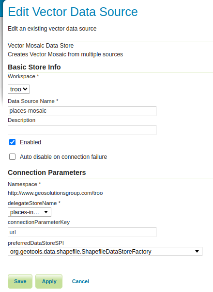 The Vector Mosaic Datastore Delegate is a datastore that contains references to the vector granule datastores, bounding polygon or multipolygon geometry to delineate the index area, and optionally other attributes that can be queried in order to return vector granules.
