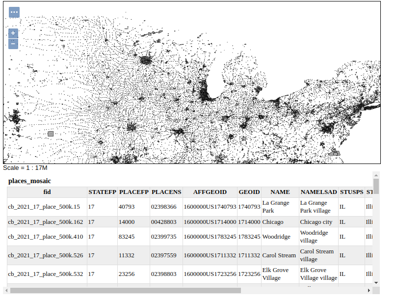 An example of a delegate in property datastore format can be found here. The name field can be used to filter the granules, while params` contains the location of the granule file andgeomits footprint. Thetypefield can be used for filtering, but also indicates the name of the feature type to be used when querying the granule store (in this case, happens to match the name of the target shapefile). Creating an Index with ogrtindex ================================ The `ogrtindex <https://gdal.org/programs/ogrtindex.html>`_ commandline tool from the GDAL library can be used to collect all data sets in a directory, and create an index table for it. The format of the location is slightly different than the one GeoServer expects, as it uses alocation,tableIndexformat, so a quick SQL needs to be run to make it match. Here is an example that generates a delegate shapefile from a directory of shapefiles. The third step below usesogr2ogrcommandline to trim a comma and number thatogrtindexappends to the end of the granule reference, and to turn the file location into a valid URL. #. Switch to directory with the shapefiles #. ogrtindex -write_absolute_path -tileindex "params" delegate_raw.shp *.shp #. ogr2ogr delegate.shp delegate_raw.shp -dialect SQLite -sql "SELECT Geometry,'file://'||SUBSTR(params,1,LENGTH(params)-2) AS params from delegate_raw" Thedelegate.shpshapefile can then be published as a store in GeoServer (no need to publish the layer), and then the mosaic store can be created, referencing to it: For example, let's say one downloads the `TIGER shapefile <https://www.census.gov/geographies/mapping-files/time-series/geo/tiger-line-file.html>`_ for thePLACEtheme, providing a shapefile with urban areas for each of the US states: .. code-block:: raw_markdown  Scripts exist that help with the bulk download of the files for a given theme and year, e.g. `get-tiger <https://github.com/fitnr/get-tiger>`_.ogrtindexandogr2ogrcan be used to generate a index shapefile, which will be then configured in GeoServer, and then serve as the base for mosaic store: .. code-block:: raw_markdown  *The store containing the delegate/index table, and the mosaic store* .. code-block:: raw_markdown  *The mosaic store refers to the delegate store by name* TheconnectionParameterKeyisurl, as that's what the Shapefile datastore is looking for, a parameter namedurlwith the location of the shapefile to open. The preferred SPI is setup to the Shapefile store to speed up the lookup of the granule store (it can be omitted, with a small performance drop). The mosaic layer can then be published in GeoServer, rendering all the required shapefiles in a single map: .. code-block:: raw_markdown  Creating FlatGeobuf Granules with ogr2ogr and ogrtindex ====================================================================== `FlatGeobuf <https://flatgeobuf.org>`_ files make for an excellent option for cloud storage of granule data due the built in support for R-Tree indices and the use of `HTTP Range requests <https://developer.mozilla.org/en-US/docs/Web/HTTP/Range_requests>`_ to limit the amount of data streamed over the network.ogr2ogrcan be used to convert a directory of shapefiles into a directory of indexed Flatgeobufs using a simple bash script like below .. code-block:: bash #!/bin/bash shopt -s nullglob FILES="/data/tiger/*.shp" for f in $FILES do fgbfilename="$(basename $f .shp).fgb" ogr2ogr -f FlatGeobuf $fgbfilename $f -nlt PROMOTE_TO_MULTI -lco SPATIAL_INDEX=YES done Here is an example that generates a delegate shapefile from the directory of FlatGeobufs. The third step below usesogr2ogrcommandline to trim a comma and number thatogrtindexappends to the end of the granule reference, and to turn the file location into a valid URL. Note the exclusion of thewrite_absolute_path. Instead we append the AWS S3 bucket URL to the generated filename. #. Switch to directory with the FlatGeoBufs. #. ogrtindex -tileindex "params" delegate_raw.shp *.fgb #. ogr2ogr delegate.shp delegate_raw.shp -dialect SQLite -sql "SELECT Geometry,'https://mybucketname.s3.amazonaws.com/'||SUBSTR(params,1,LENGTH(params)-2) AS params from delegate_raw" #. Upload FlatGeobuf granule files to the S3 bucket referenced in the earlier step (and confirm that the bucket contents are publicly available). At this point you can publish thedelegate.shp`` shapefile as a store in GeoServer as described in the previous example or you can load it into PostGIS before publication (see Smart Data Loader for a tool for creating the PostGIS store). A PostGIS delegate is especially useful mosaics that might change over time due to support for concurrent edits, high rate loading and transactions. Note that because the granule references in the index are HTTPS URLs the index FlatgeoBuf can be hosted anywhere that your GeoServer installation can access.