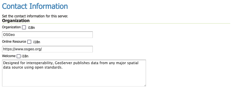 The welcome message is displayed in the welcome page header as an introduction to the GeoServer web services. The organization name and online resource, if provided, are used in the welcome page header for the For more information visit link.
