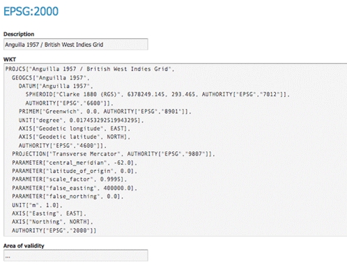 The title of each SRS is composed of the author name and the unique integer identifier (code) defined by the Author. In the above example, the author is the European Petroleum Survey Group (EPSG) and the Code is 2000. The fields are as follows: