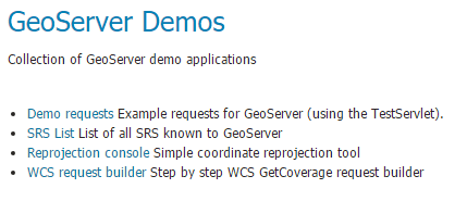 This page has example WMS, WCS, and WFS requests for GeoServer that you can use, examine, and change. Select a request from the drop down list.