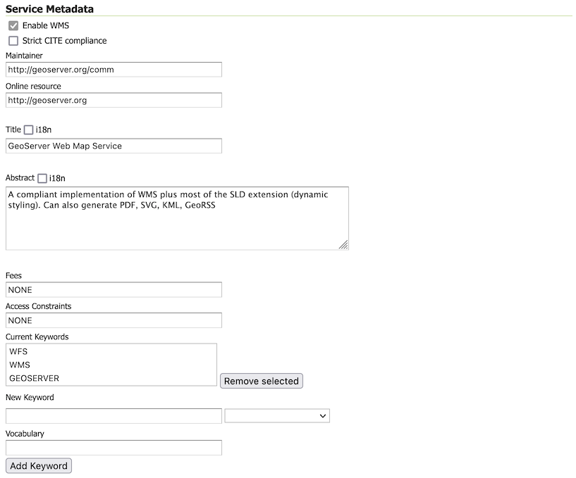 - Specifies whether the respective services --WCS, WFS or WMS-- should be enabled or disabled. When disabled, the respective service requests will not be processed.