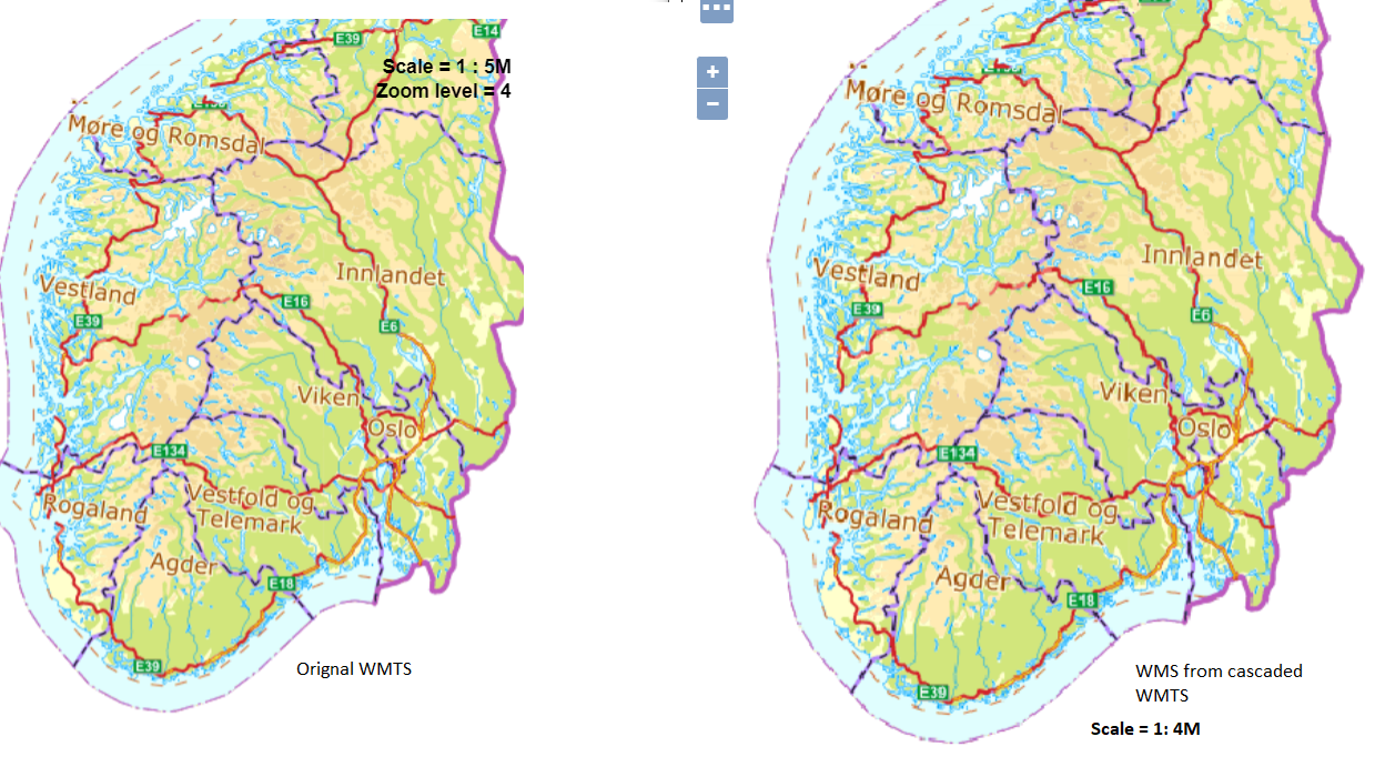 This figure compares the resulting image from a WMTS to a cascaded layer which has been slightly stretched or scaled outLeft image shows a original wmts layer at its defined zoom level 4 which scale denominator is about 4M