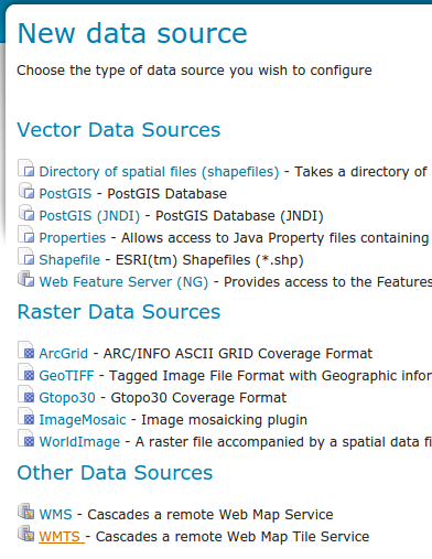 To connect to an external WMTS, it is necessary to load it as a new store. To start, in the Web administration interface, navigate to Stores --> Add a new store --> WMTS. The option is listed under Other Data Sources.