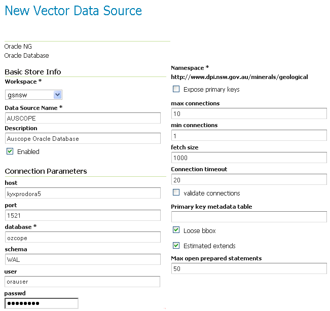 Recent versions of Oracle support connecting to a database via either a SID name or a Service name. A SID connection descriptor has the form: host:port:database, while a Service connection descriptor has the format host:port/database. GeoServer uses the SID form by default. To connect via a Service, prefix the database name configuration entry with a /.