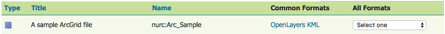Each layer row consists of a type, name, title, and available formats for viewing.