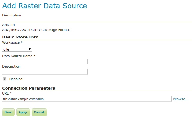 The next page configures the store. Since connection parameters differ across data sources, the exact contents of this page depend on the store's specific format. See the sections Vector data, Raster data, and Databases for information on specific data formats. The example below shows the ArcGrid raster configuration page.