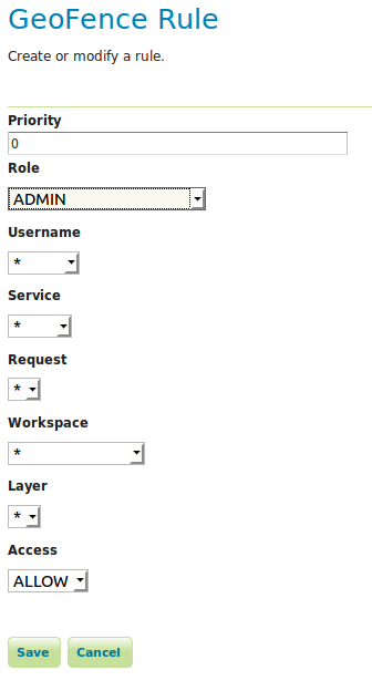Again, you should receive a 201 Created HTTP Response. When browsing to the URL http://localhost:8080/geoserver/geofence/rest/rules we should now see the following information: