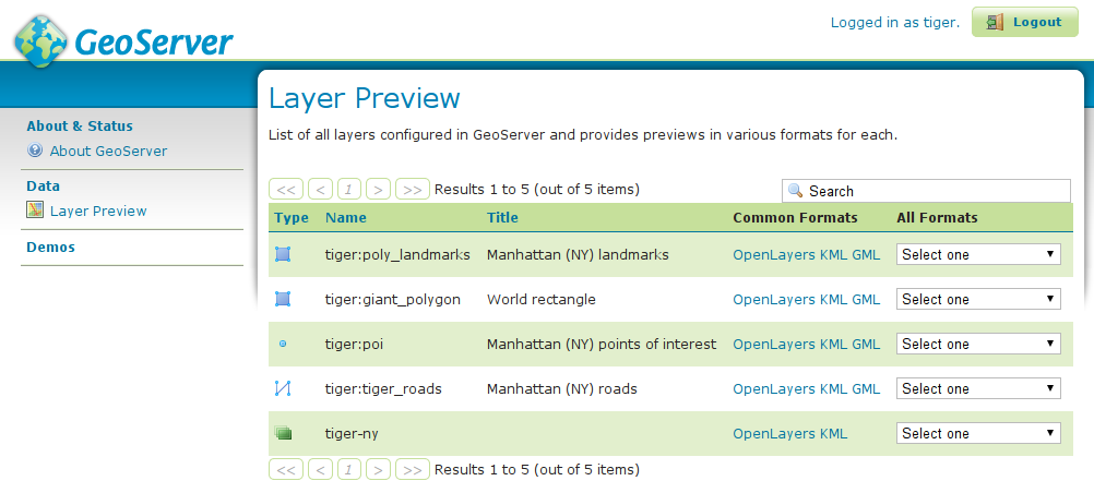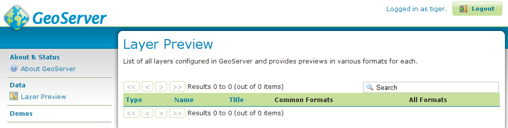 Login again in GeoServer as user tiger and you will see in layer preview all the layers in the