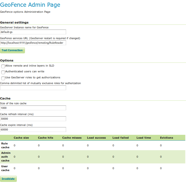 - GeoServer instance name: the name under which this GeoServer is known by the GeoFence server. This is useful for when you use an external GeoFence server with multiple GeoServer servers.