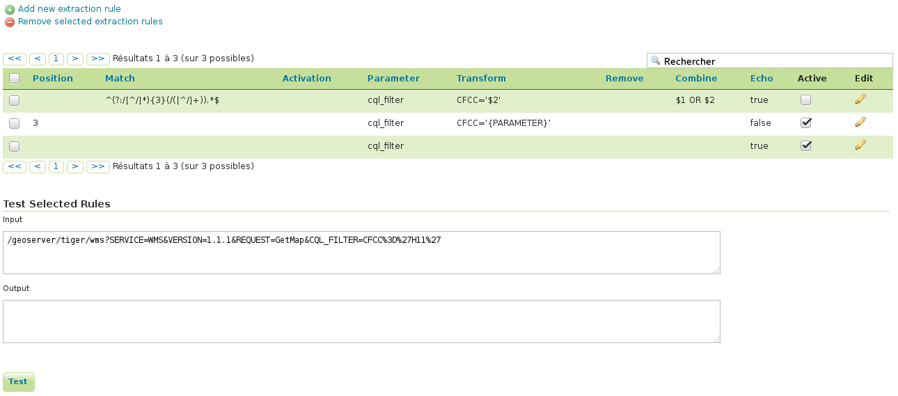 This module is configured by a set of rules that will be applied to the incoming URLs. Note that a get capabilities result will include the original URL maintaining the extra filter.
