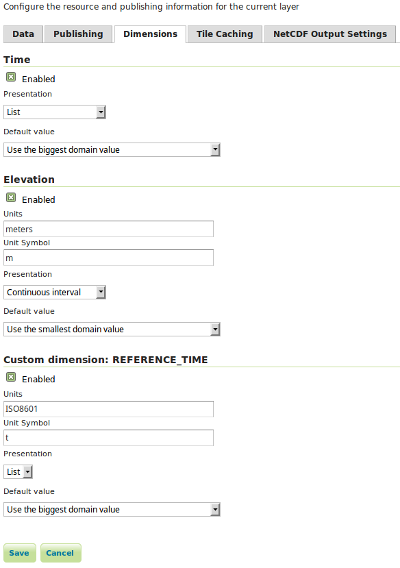 This module support well defined dimensions like elevation and time, but also custom dimensions.