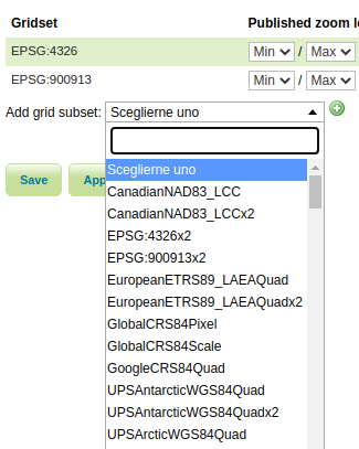 This section shows the gridsets that will be automatically configured for cached layers. While there are some pre-configured gridsets available, only two are enabled by default. These correspond to the most common and universal cases: