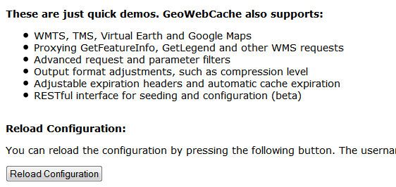 The demo page contains a list of every layer that GeoWebCache is aware of. This is typically (though not necessarily) identical to the list of layers as published in the GeoServer WMS capabilities document. If configuration changes are made to GeoServer, GeoWebCache will not automatically become aware of them. To ensure that GeoWebCache is using the latest configuration information, click the Reload Configuration button. Reloading the configuration will trigger authentication to GeoServer, and will require an administration username and password. Use the same username and password that you would use to log on to the Web administration interface. After a successful logon, the number of layers found and loaded will be displayed.