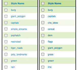 Searching can be used to filter the number of items displayed. This is useful for working with data types that contain a large number of items. To search data type items, enter the search string in the search box and click Enter. GeoServer will search the data type for items that match your query, and display a list view showing the search results.