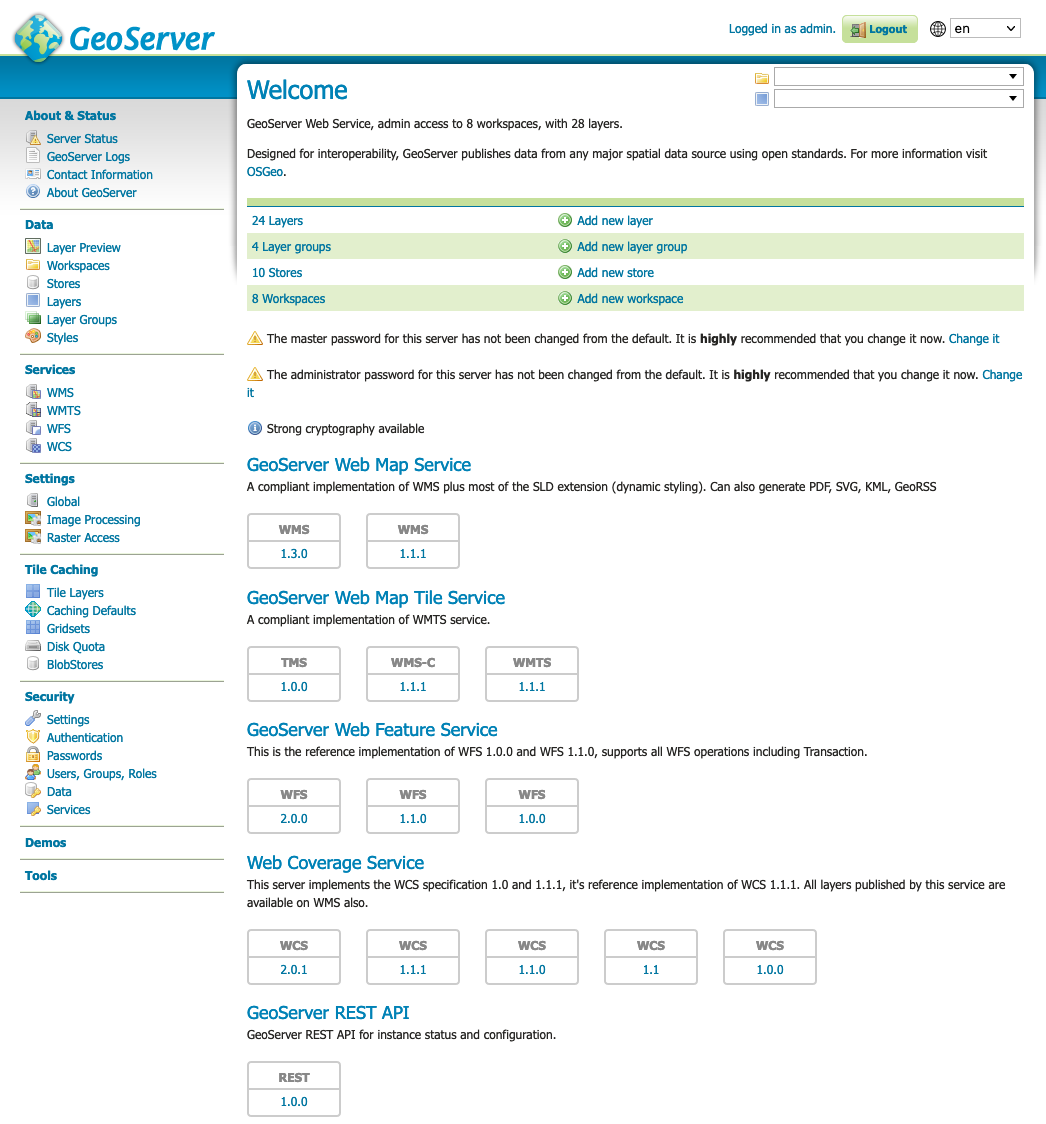 GeoServer has a browser-based web administration interface application used to configure all aspects of GeoServer, from adding and publishing data to changing service settings.