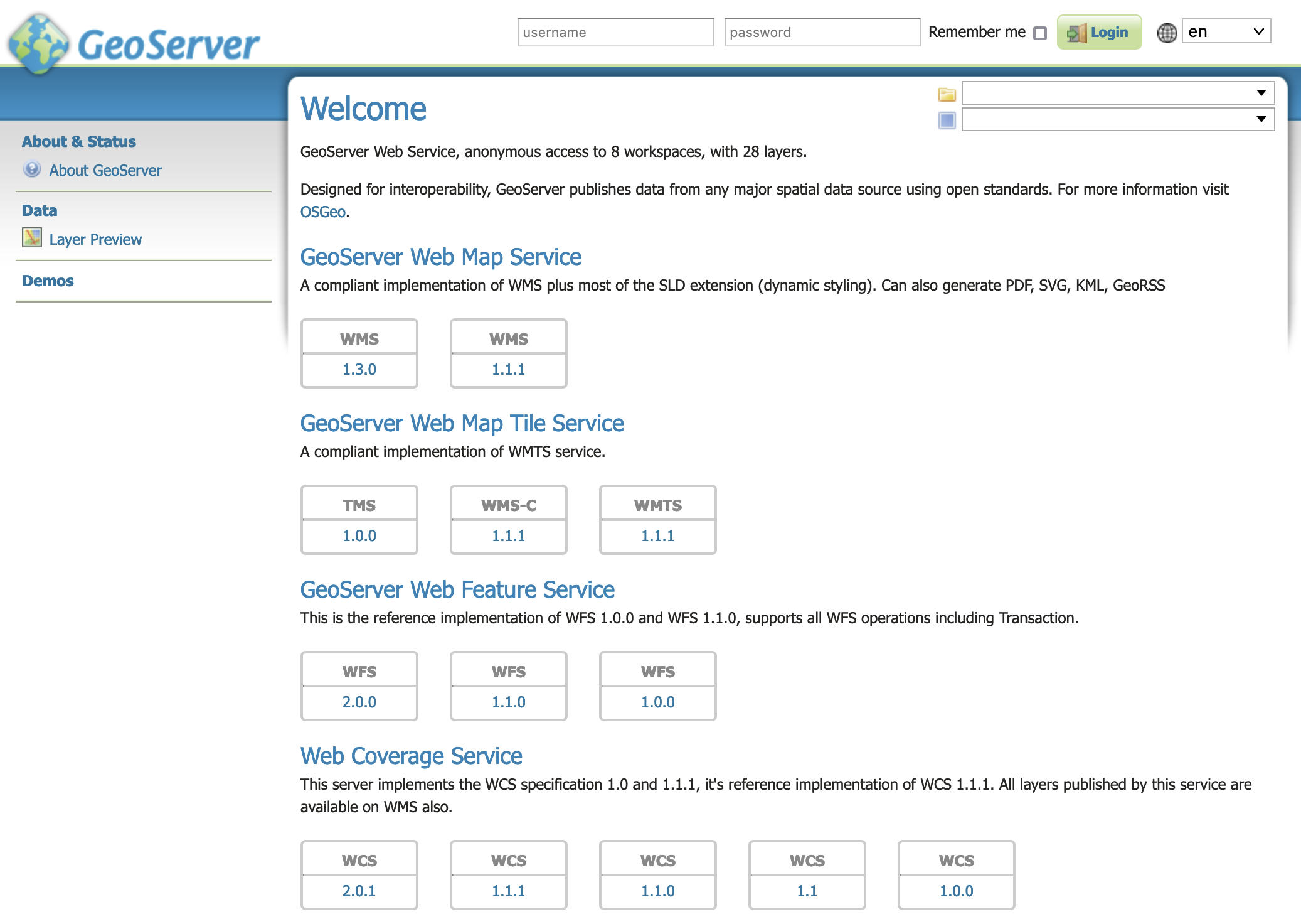 http://localhost:8080/geoserver(or wherever you installed GeoServer) to access the GeoServer Web administration interface.If you see the GeoServer Welcome page, then GeoServer is successfully installed.
