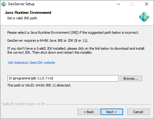 Enter the path to a valid Java Runtime Environment (JRE). GeoServer requires a valid JRE in order to run, so this step is required. The installer will inspect your system and attempt to automatically populate this box with a JRE if it is found, but otherwise you will have to enter this path manually. When finished, click Next.
