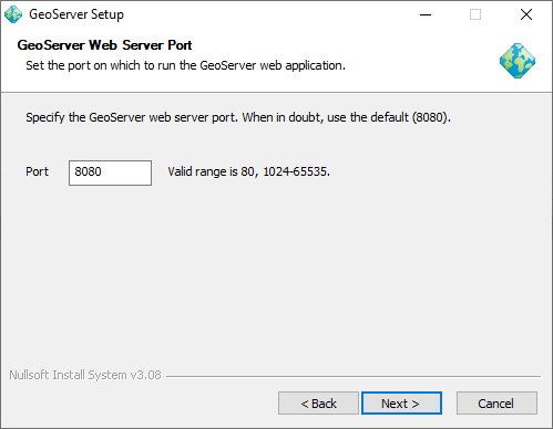 Enter the port that GeoServer will respond on. This affects the location of the GeoServer Web administration interface, as well as the endpoints of the GeoServer services such as Web Map Service (WMS) and Web Feature Service (WFS). The default port is 8080, though any valid and unused port will work. When finished, click Next.